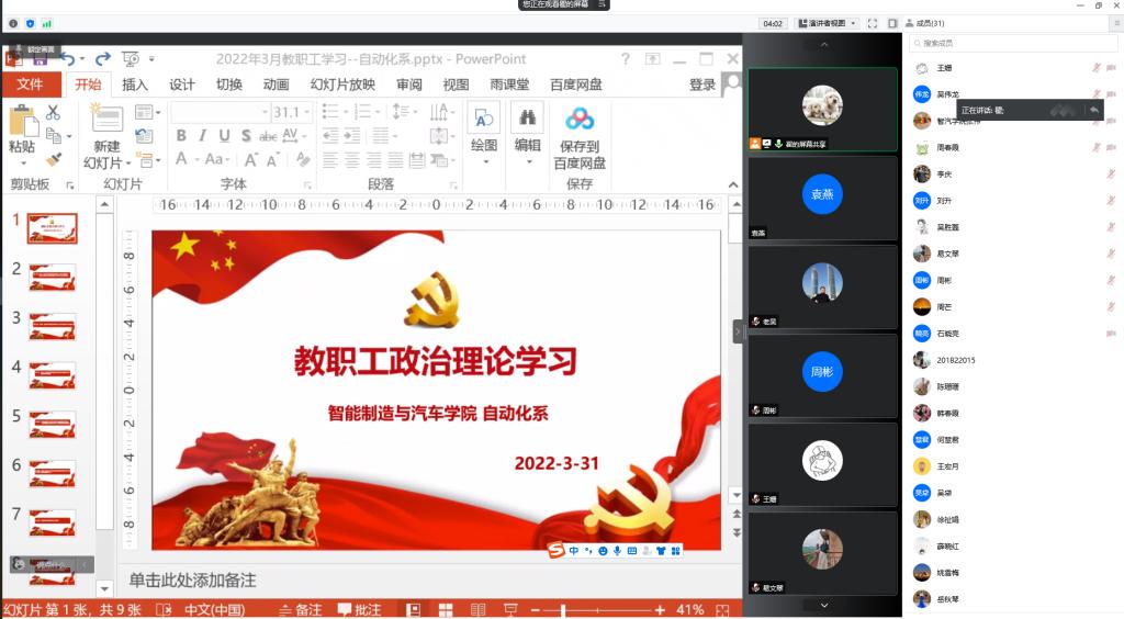 为切实提高全系教师的思想政治理论水平、业务素质和职业道德修养,积极推进师德师风建设,3月31日晚自动化系党支部通过腾讯会议平台召开了3月集中政治理论学习会。会议由自动化系第二党支部书记瞿兴鸿同志主持,自动化系全体教师参加。