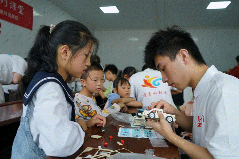 短暂休息后,“车行千里,‘语’通天下”科普课堂正式拉开帷幕,这不仅是一场科技与创意的碰撞,更是一次普通话推广的生动实践。实践队员们分组对小朋友们进行指导,耐心细致地讲解电力小车拼装技巧,小朋友们也积极响应。拼装好小车后,实践队员又指导小朋友们使用普通话发出指令,让小车进行前进、后退、转弯等操作。随着一辆辆小车“试驾”成功,小朋友们通过动手劳动获得了快乐和满足感,脸上也浮现出成功的喜悦。本次课堂有效融合了科技教育与语言文化,充满了互动性和趣味性,小朋友们不仅掌握了小车拼装知识,使用国家标准语言文字进行表达的能力也得到了锻炼。