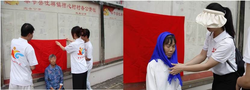为了给村民留下美好的记忆,实践队队员还在村委会精心搭建起了临时摄影场地,为村民们拍摄艺术照和证件照,希望在这一个小小的摄影的摄影活动中,给村民带来快乐,丰富他们的精神文化生活。实践队队员携带了专业摄像机,以认真负责的态度,全身心的投入到拍摄工作中。实践队队员不断地调整着角度,光线,构图去捕捉村民们自然美好的瞬间。有一些村民是第一次面对专业的相机镜头,显得很拘谨,但经过实践队员们耐心细致的沟通,帮助他们调整姿势和表情,最终一张张完美的照片呈现在大家的面前,村民们看着照片露出了满意的笑容。