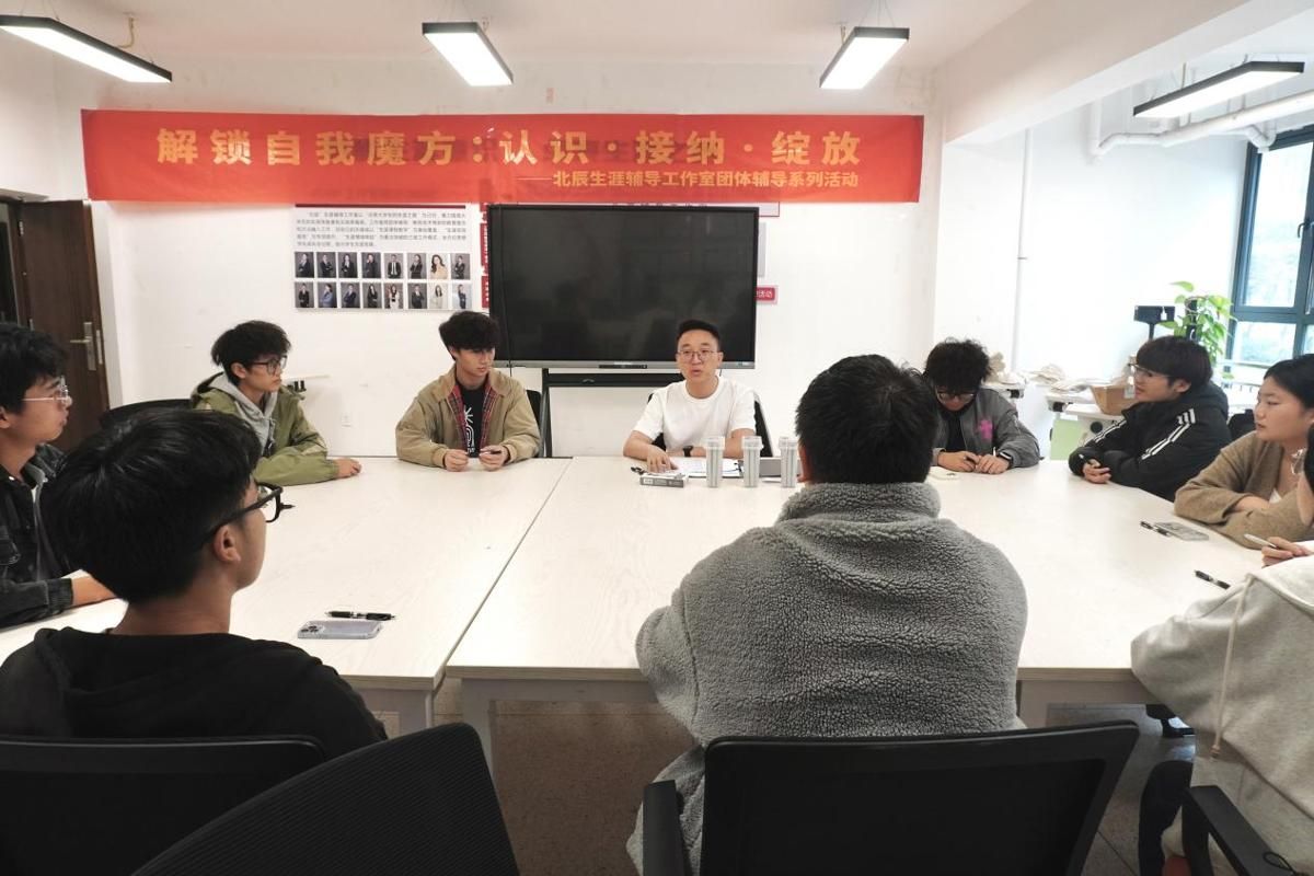 为帮助25级新生适应老员工活、探索职业方向、认知自我优劣势,11月13日下午2点,北辰生涯辅导工作室在李苑五舍青创工作室举办“解锁自我魔方:认识·接纳·绽放”主题团体辅导活动,由戴宇豪老师带领,12名不同专业大一新生参与。