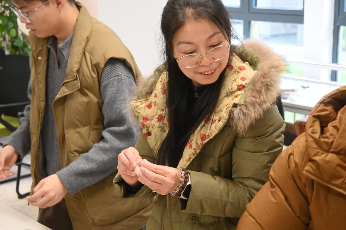 活动现场,揉面、擀皮、填馅、捏合等环节有序推进,师生默契配合,沉浸其中。丁伟书记、王勇经理全程参与活动,与师生亲切交流,不时驻足观看大家包制饺子的过程,现场氛围热烈而有序。活动过程中,师生也围绕资助政策、课堂学业、职业规划、校园生活等话题深入交流,师生情谊在协作中不断深化,现场温馨而热烈。