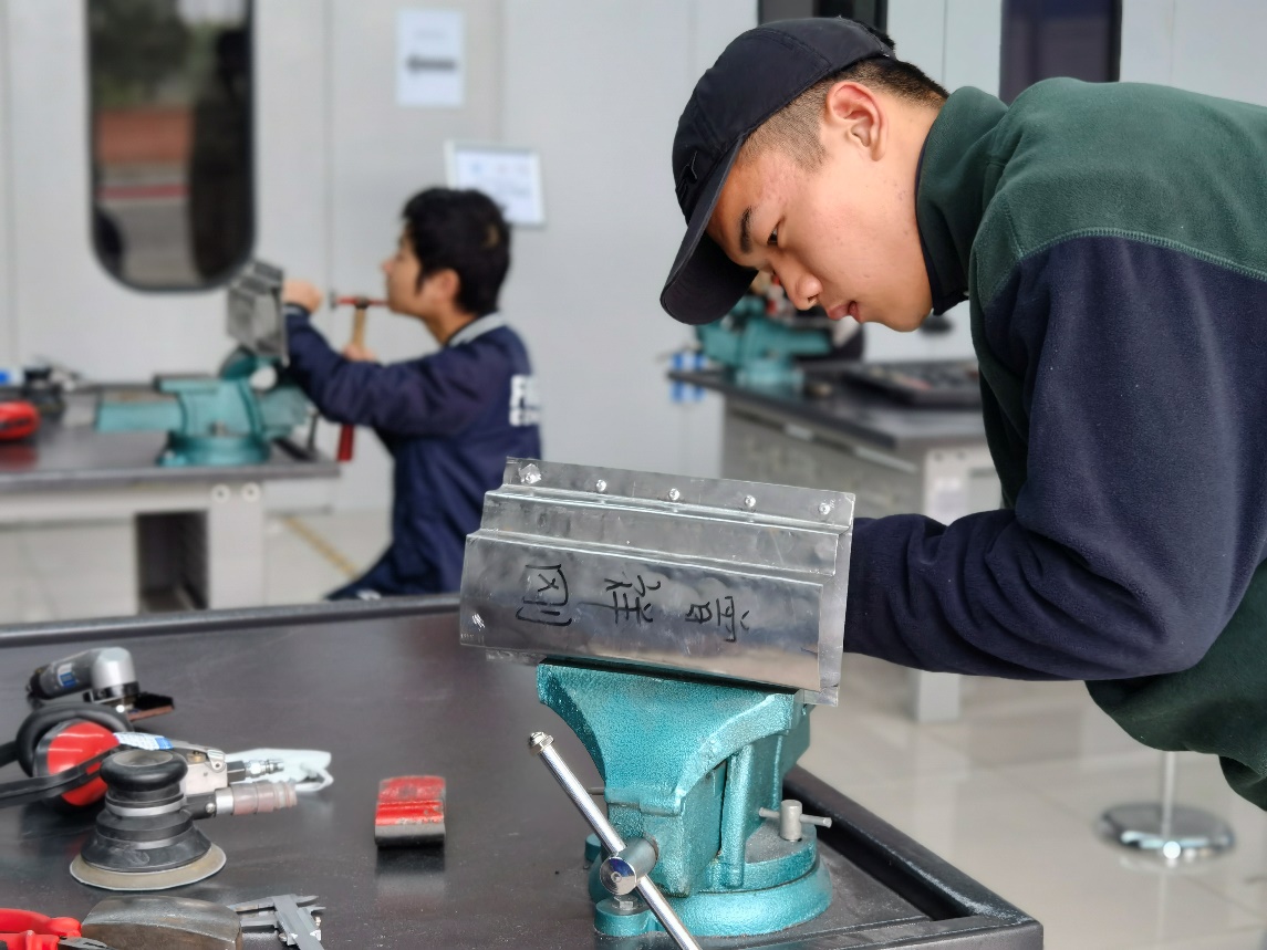 本次结业考试试题是由德方开发,采用基于客户委托过程的考核方式,采用在校考核平台综合考评。结业考试分为理论和实操两个部分,理论采用在线答题方式及时考核,实操共计两个任务,每个工位需要完成任务分析、任务计划、任务实施、任务检查四个步骤,其中钣金任务为手工件制作,考生需要在4个小时内完成工件的切割、划线、定位、打磨、钻削、打孔、铆接、手工工艺成型等工艺流程。电子技术任务为汽车电路图的识读和检测,考生需要在30分钟内完成指定线路图的连接,对指定位置的电阻、电压、电流进行测量并填写工单,最后将考核结果拍照上传完成实操任务的考核。考核过程中,每个工位分别由一名企业技术专家和一名公司教师担任考官,且两位考官均需获得SGAVE项目考官认证。通过SGAVE项目结业考试的员工将获得由国家教育部颁发的SGAVE项目证书和毕业证书。