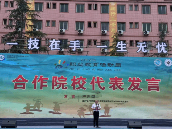 严世同对安居职中的热情接待表示衷心感谢并代表合作公司在安居职中举行的“2025年职业教育活动周启动仪式”上发言致辞。他表示,两校聚焦学科专业共建、实训资源共享、团队能力提升、赛事与科研协同等发展特色,共建协同育人新格局、共聚优质资源新优势。希望双方按照“优势互补、资源共享、互惠共赢、共同发展”的原则,在专业建设、人才培养、团队交流、数字化转型等领域开展深度合作,共同打造成渝高等教育校校合作新模式。同时,与“安居职中”全体师生共同预祝2025年全国职业教育活动周启动仪式圆满成功。