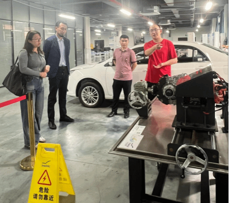 外宾先后参观了新能源汽车技术实训室、智能网联汽车技术实训室、重电-长安校企实训基地及汽车底盘实训室,详细了解了公司在智能制造与汽车领域的教学设施、实训设备及校企合作成果。参观过程中,Adilet Zaurenbek对公司先进的实训设备和实践教学模式给予了高度评价。他表示:“贵校的实训条件非常完善,我们希望能派遣哈萨克斯坦高校的教师来此进行培训学习,共同提升技术技能人才培养水平。”