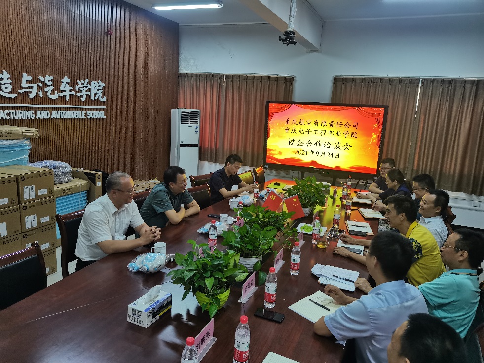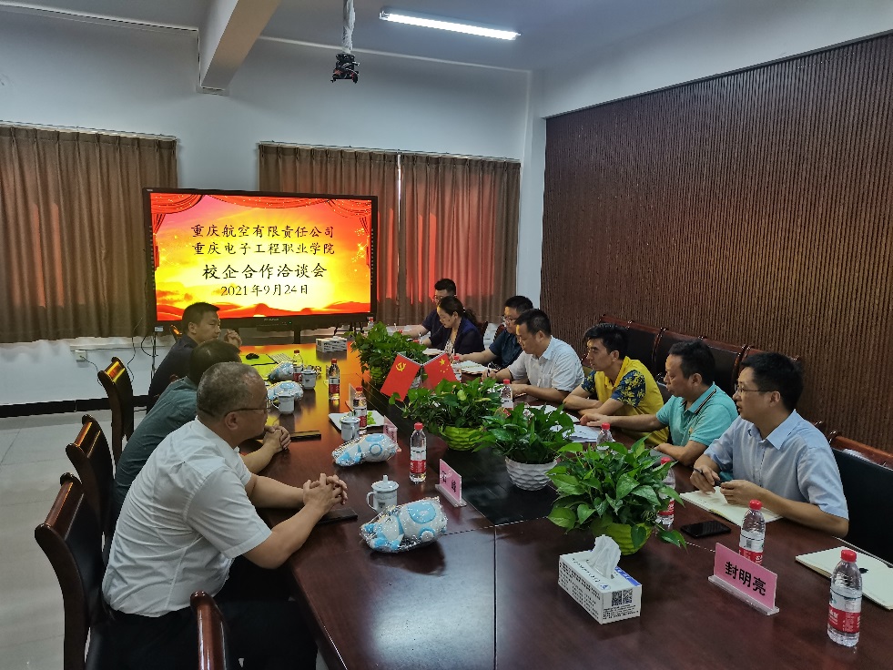 9月24日下午,重庆航空有限责任公司-重庆电子工程职业公司校企合作洽谈会在公司太阳网集团tcy8722召开,太阳网集团tcy8722书记张进春,主管副经理叶勇,副经理王勇对重庆航空有限责任公司培训部总经理张锋、副总经理石峰,培训部主任张志伟领导们一行来校交流表达了热烈的欢迎之情。公司党政办主任封明亮、自动化系书记尹玲、系主任吴德明、项目管理科副科长李成,飞行器维修技术专业带头人廖灿星博士,教师曹强参会。此次交流洽谈围绕“重电-重航”校企合作相关事宜展开,主要讨论建设高标准、高质量专业实训平台,助推“飞行器维修技术专业群”高速建设,探索校企合作、协同育人新模式,开启校企合作、协同育人新征程,提升专业区域影响力。