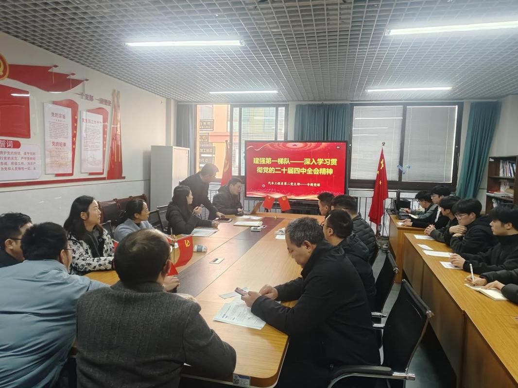 为深入贯彻落实党的二十届四中全会精神,引导师生党员深刻把握“十五五”规划的核心要义与战略部署,汽车工程系第二党支部于2025年12月11日召开专题学习会。会议通过系统宣讲、案例剖析与研讨交流相结合的方式,聚焦全会重大意义、目标任务及实践路径,结合高校立德树人根本任务与学科特色,推动全会精神入脑入心、见行见效。