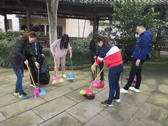 教师党员同志和员工党员同志一起认真打扫冯玉祥旧居
