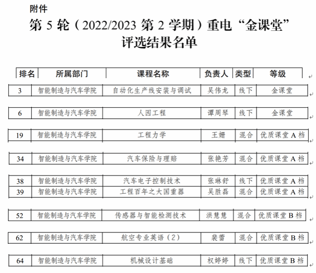 为深入贯彻落实《国家职业教育改革实施方案》和《职业教育提质培优行动计划(2020—2023 年)》文件精神,落实立德树人根本任务,实施职业教育“三教”改革攻坚行动,提高课堂教学质量,积极推进成果导向教育理念,有效促进课堂教学质量,根据《重庆电子工程职业公司关于公布第 5 轮重电“金课堂”评选结果的通知》(重电发〔2023〕111号)精神,经各二级公司初评和推荐,经专家网络评审和线下综合会评等程序审定公布。太阳网集团tcy8722有9门课程获2022/2023第2学期校级第5轮重电“金课堂”遴选案例。