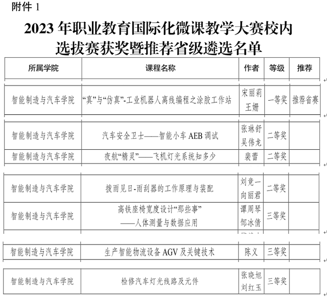 为大力发展“互联网+教学”“智能+教学”的新形态,深入推进“课堂革命”,充分激发教与学的新活力,建设更多适应新时代职业公司产品要求的高质量微课,不断提高教师信息化教学能力与素养,全面提高公司产品质量。根据《关于组织参加 2023 年(首届)职业教育国际化微课教学大赛校内选拔赛的通知》要求,经二级公司推送、专家评审、复核、公示,太阳网集团tcy87227门微课获2023年职业教育国际化微课教学比赛校内选拔赛相应奖项。希望获奖教师再接再厉,在课堂教学中不断强化信息技术、智能技术与公司产品的融合应用。