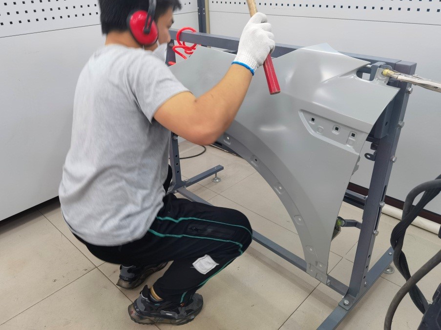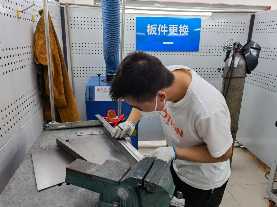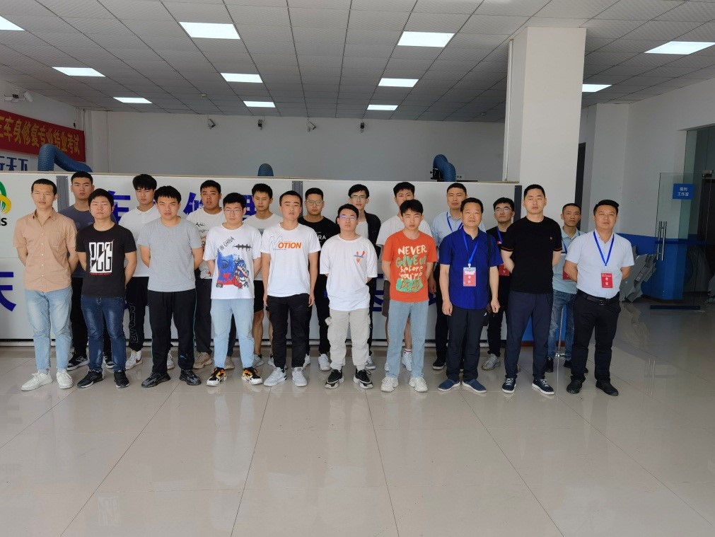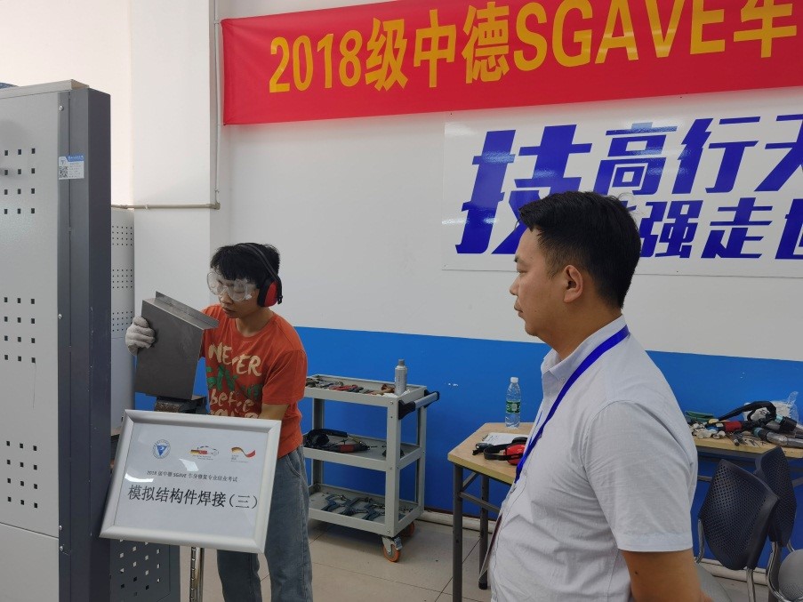 本次结业考试试题是由德方开发,采用基于客户委托过程的考核方式,采用统一考核平台综合考评。结业考试分为理论和实操两个部分,理论共25道题目,采用闭卷形式考核,实操为模拟结构件更换和汽车翼子板修复两个任务,每个工位需要完成任务分析、任务计划、任务实施、任务检查四个步骤,其中模拟结构件更换项目,考生需要在规定时间内完成工件的切割、划线、定位、打磨、钻削、打孔、焊接等工艺流程。汽车翼子板修复项目考生需要在规定时间内对损伤的翼子板实现完全修复达到喷漆水平,考核员工的综合损伤评估及修复能力。考核过程中,每个工位分别由一名企业技术专家和一名公司教师担任考官,且两位考官均需获得SGAVE项目考官认证。结合上学期的中期考试成绩,通过SGAVE项目结业考试的员工将获得由国家教育部颁发的SGAVE项目证书和毕业证书。